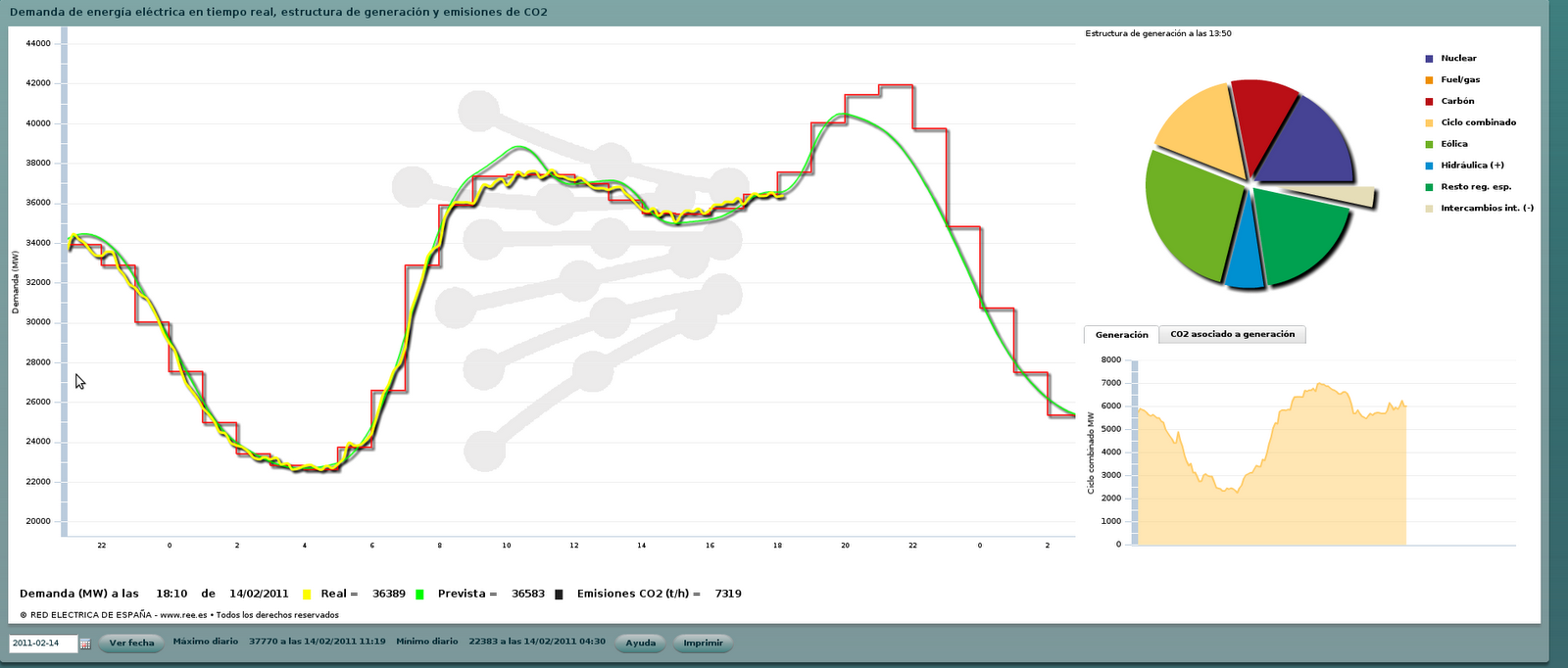 Curiosamente, todas estas previsiones y consumos pueden ser consultados en la web de la Red Eléctrica Española (REE) mediante unas vistosas e intuitivas gráficas que guardan datos desde enero de 2007 hasta este mismo instante, pues se actualiza en tiempo real. Si jugamos un poco con ellas podemos conocer en cada instante que cual es la demanda prevista y cual está siendo la que realmente consumida. Además nos permite conocer en porcentaje cuanta electricidad proviene de producción eólica, nuclear, hidráulica etc.